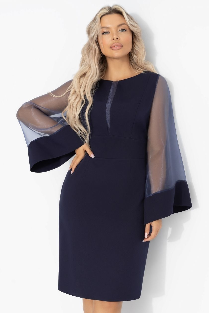 Платье-футляр синее со свободными рукавами от компании Charutti. Модель приталенного силуэта, выполнена из костюмного полотна "барби". Рукава широкие, расклешенные, из органзы. Изделие застегивается на скрытую молнию. Идеальный выбор для создания элегантного образа.