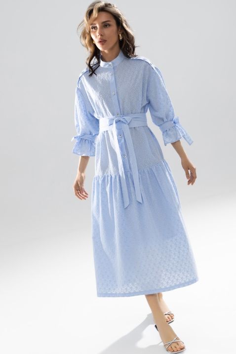 Платье голубое из шитья с поясом от бренда Charutti. Модель свободного силуэта, на подкладе из штапеля. Воротник-стойка, рукава укороченные с завязками. По переду застёжка на пуговицы. Отрезное ниже линии талии. В этом платье вы будете королевой вечера!