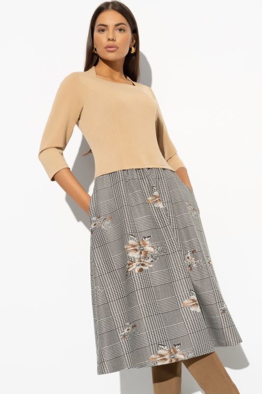 Платье трикотажное комбинированное с карманами от компании Charutti. Модель полуприлегающего силуэта, фигурный вырез горловины. Втачной рукав длиной 3/4. Имитация блузки и расклешённой юбки. Это Ваш отличный образ, в котором вы всегда чувствуете себя уверенно.