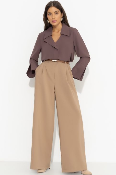 Брюки-палаццо бежевые с карманами от компании Charutti. Модель широкого кроя, высокая посадка на талии, выполнена из костюмной ткани "барби". Пояс классический со шлевками, на пуговице и молнии. Идеальный выбор для городских модниц. Ремень из экокожи в комплект не входит, продается отдельно.