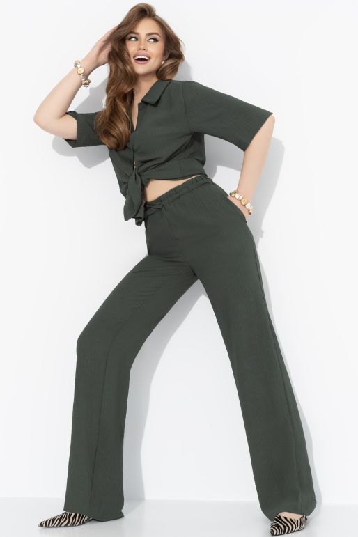 Брюки зелёные с карманами от компании Charutti. Модель прямого силуэта, выполнена из плательной ткани, притачной пояс на резинке с завязками. Идеальный выбор для городских модниц.