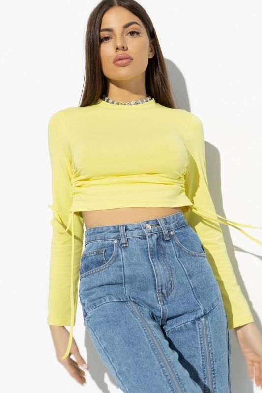 Укороченный жёлтый лонгслив с кулисками и завязками по бокам от компании Charutti. Модель полуприлегающего силуэта, выполнена из трикотажа «кулирная гладь». Круглый вырез горловины. Втачные длинные рукава. Идеальный выбор на каждый день.