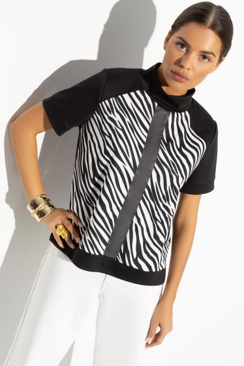 Водолазка комбинированная чёрная с принтом от компании Charutti. Модель прямого силуэта, воротник-стойка. Втачные короткие рукава на манжетах. Низ асимметричный с разрезами, на манжете. Это Ваш отличный образ, в котором вы всегда чувствуете себя уверенно.