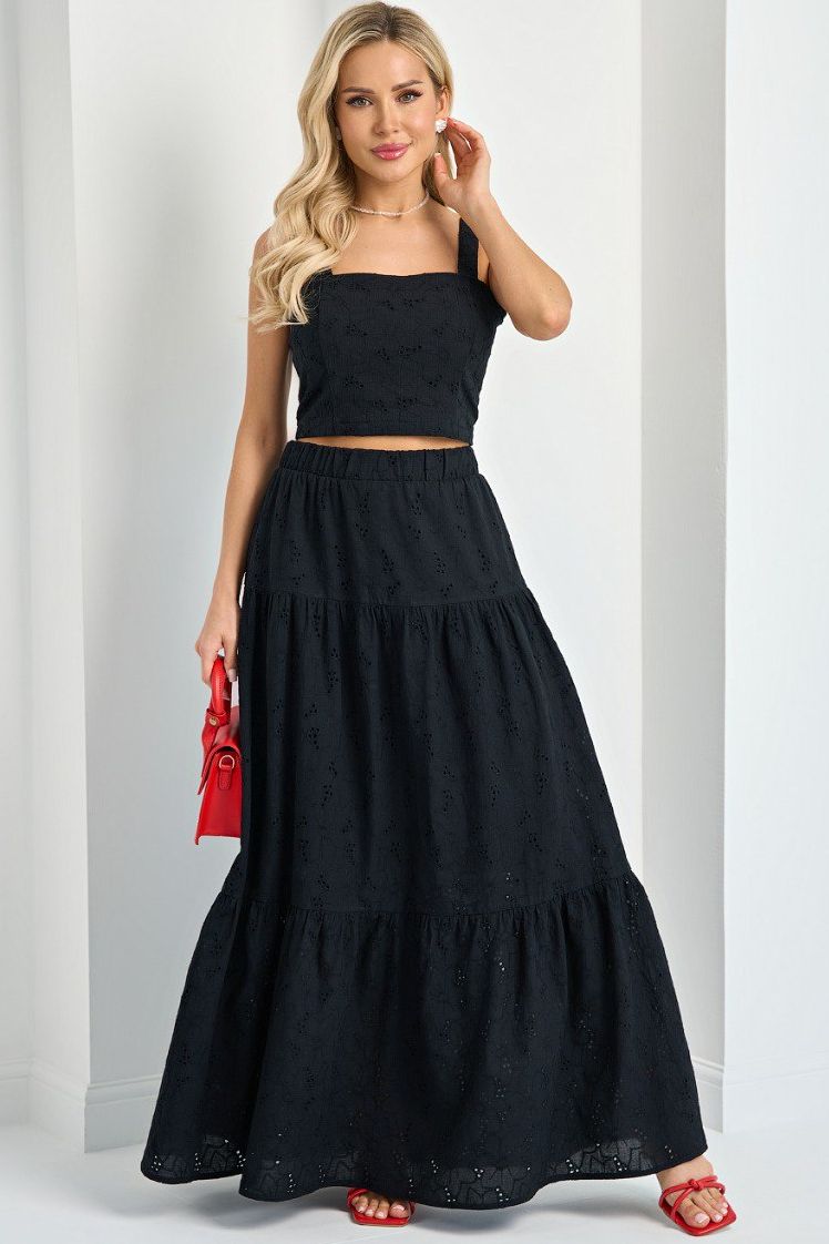 Юбка чёрная макси ярусная от компании Jetty. Модель расклешённого силуэта, выполнена из ткани шитье. Пояс на резинке. Юбка на подкладе. Идеальный выбор для городских модниц.