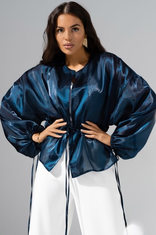 Жакет нарядный синий из органзы от компании Charutti. Свободный укороченный. Пояс на тонких завязках. Спущена линия рукава. Рукав оформлен длинными завязками. Идеальный выбор для создания стильного образа.