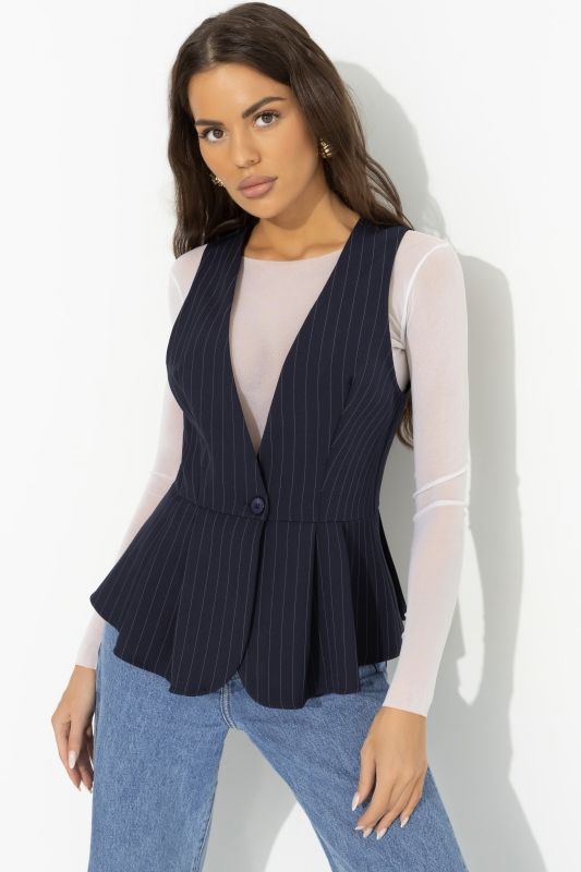 Жилет синий в полоску от компании Charutti. Модель приталенного силуэта, выполнена из костюмного полотна. Без лацканов. Застегивается на одну пуговицу. Подол оформлен баской. Без подклада. Хорошо смотрится, как самостоятельный предмет гардероба и как второй слой.